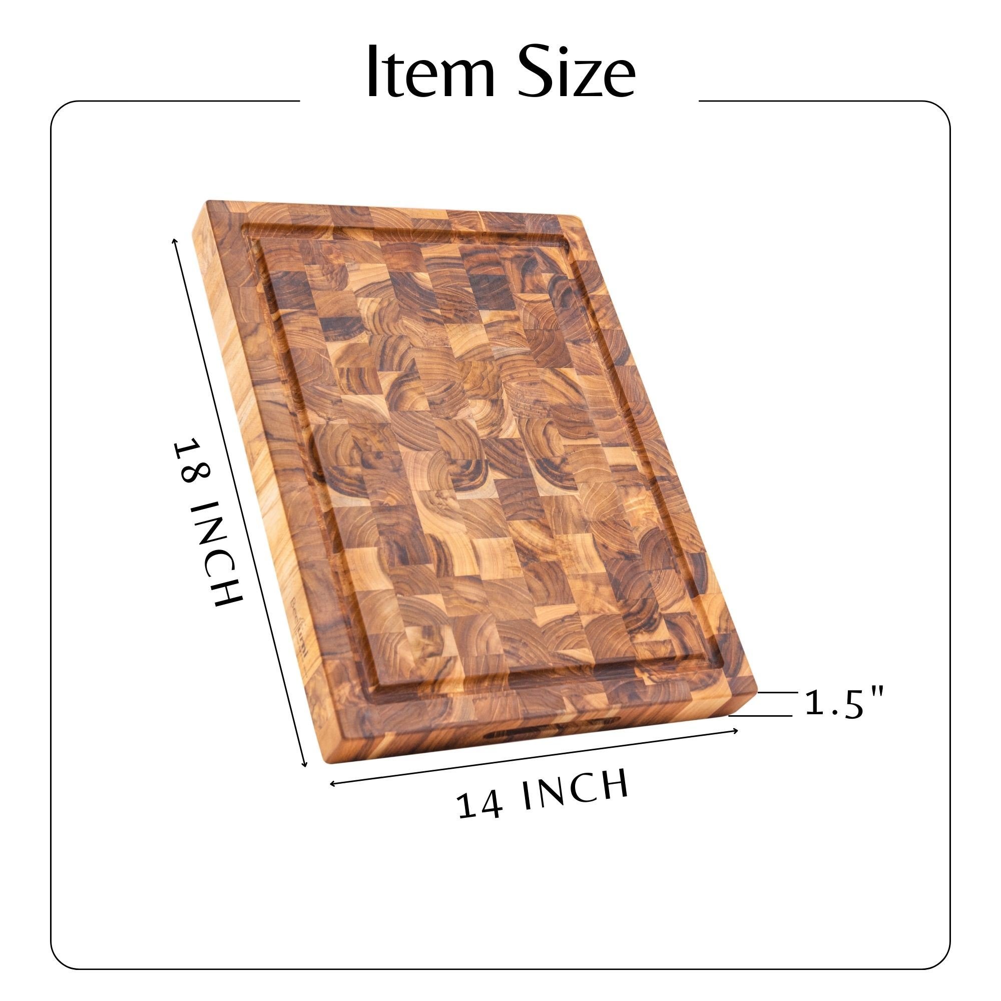 End Grain Teak Cutting Board Reversible Chopping Serving Board (1Pcs)[Brand] offers a wide range of wooden products that can definitely answer the needs of home organization and decoration lovers. Crafted from high-quality natural wood, our products include wooden racks, shoe racks, stools and cutting boards. Not only do they highly functional, but the minimal yet trendy designs of our products also make them a great décor for your beloved houses. This thick cutting board is made of 100% teak wood that is strong and durable. It's designed to have an extra-wide juice groove that allows juices, oil or loose pieces of food to sit and pool, to reduce spills while cutting and keeping your kitchen and dining areas clean. Easy-to-grip design. This multipurpose board is reversible and can be used on both sides. This wood board is food safe and eco-friendly. Its perfect for cutting or chopping meat, vegetable, fruit, bread or cheese. It can also be used as a platter to serve fancy breakfast, lunch, dinner at home, a café or a restaurant.